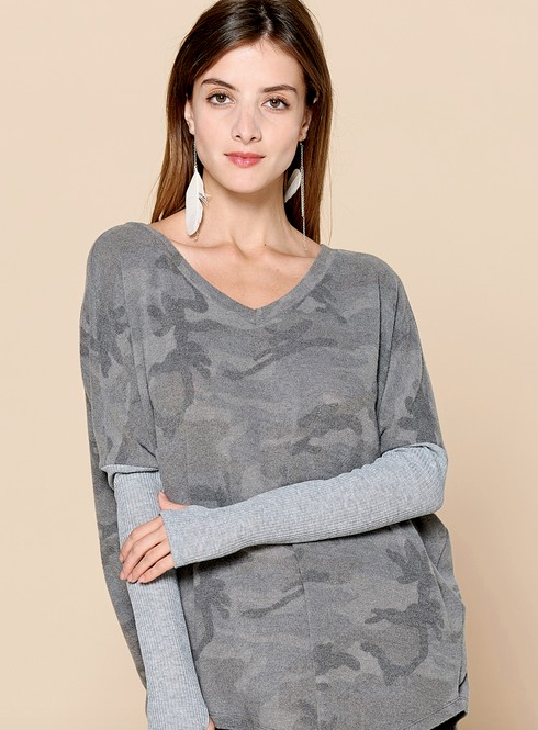 PLUS Camouflage printed brushed knit loose-fit top featuring a v-neckline, asymmetrical hem, and solid ribbed contrast long sleeves. IN GREEN OR GREY