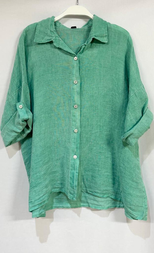BUTTON DOWN LINEN ROLL UP SLEEVE TOP IN AQUA AND TURQUOISE