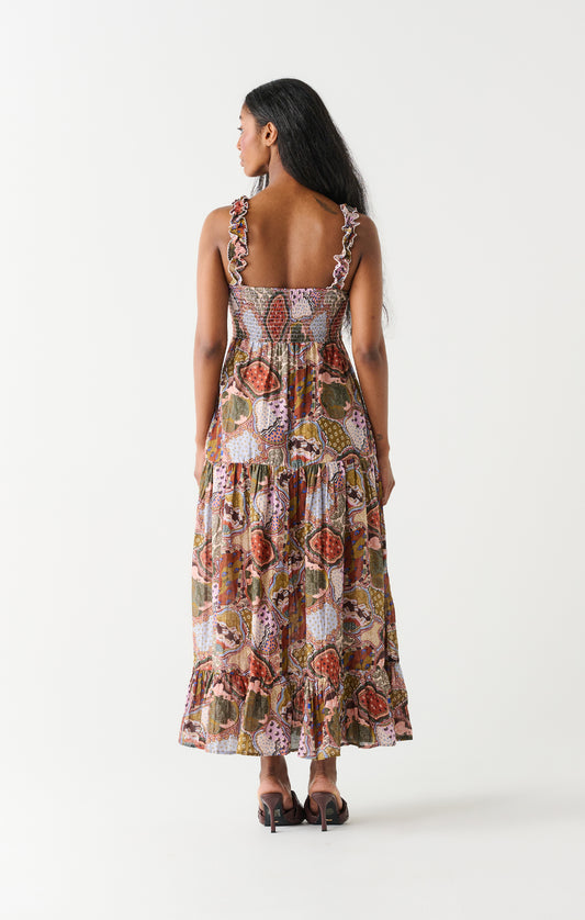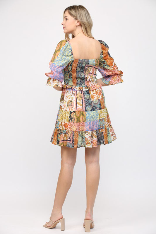 PATCH WORK PRINT SMOCKED BODICE DRESS