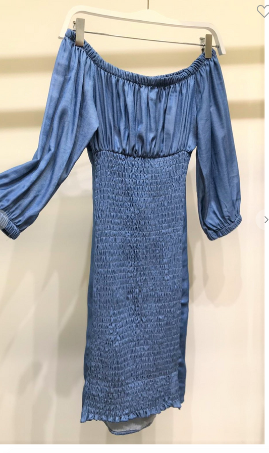 OFF SHOULDER CHAMBRAY BUTTON DOWN DETAIL DRESS