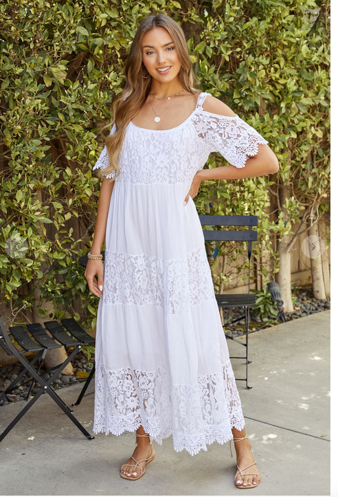 EMBROIDERED LACE PANEL COLD SHOULDER DRESS IN BEIGE