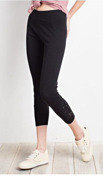 BLACK SOFT LEGGING WITH ELASTIC WAIST, CROPPED, STRETCHY FIT, FEATURED FLORAL EMBROIDERY DETAILING LEGGINGS