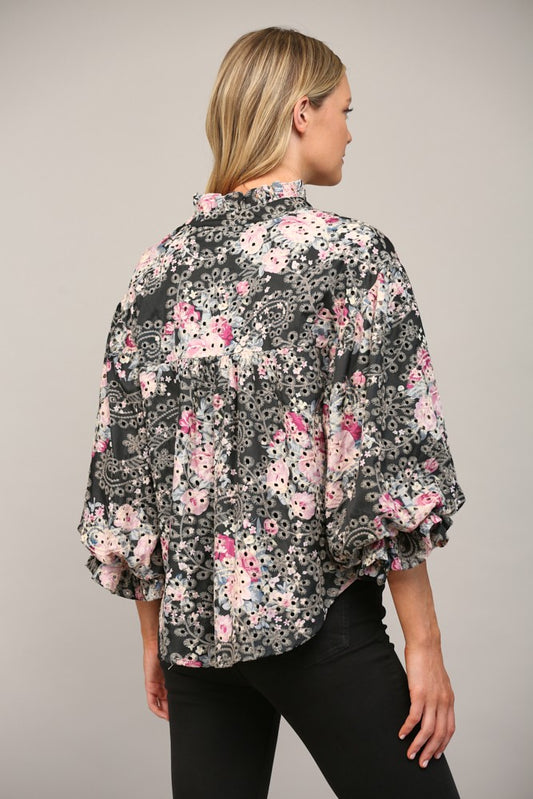 FLORAL PRINT BRODERIE BUBBLE SLEEVE BLOUSE