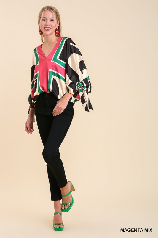 Satin Print Batwing Wrist Tie Top with Back String Tie Details