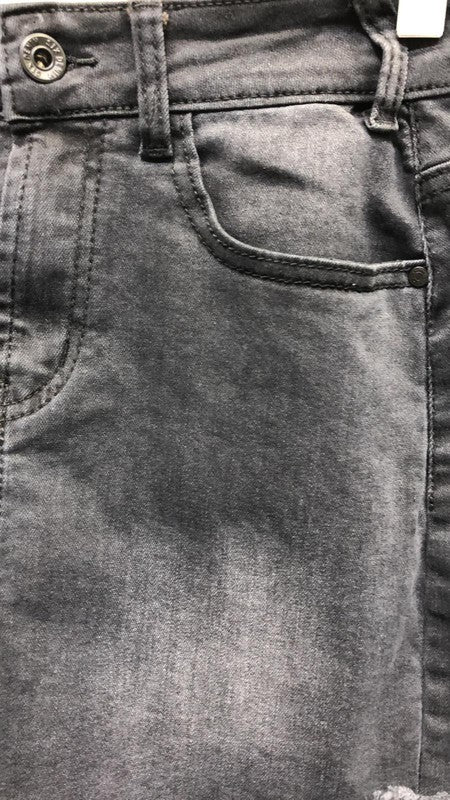 2 TONE FRINGE HEM DENIM SKIRT POCKETS
