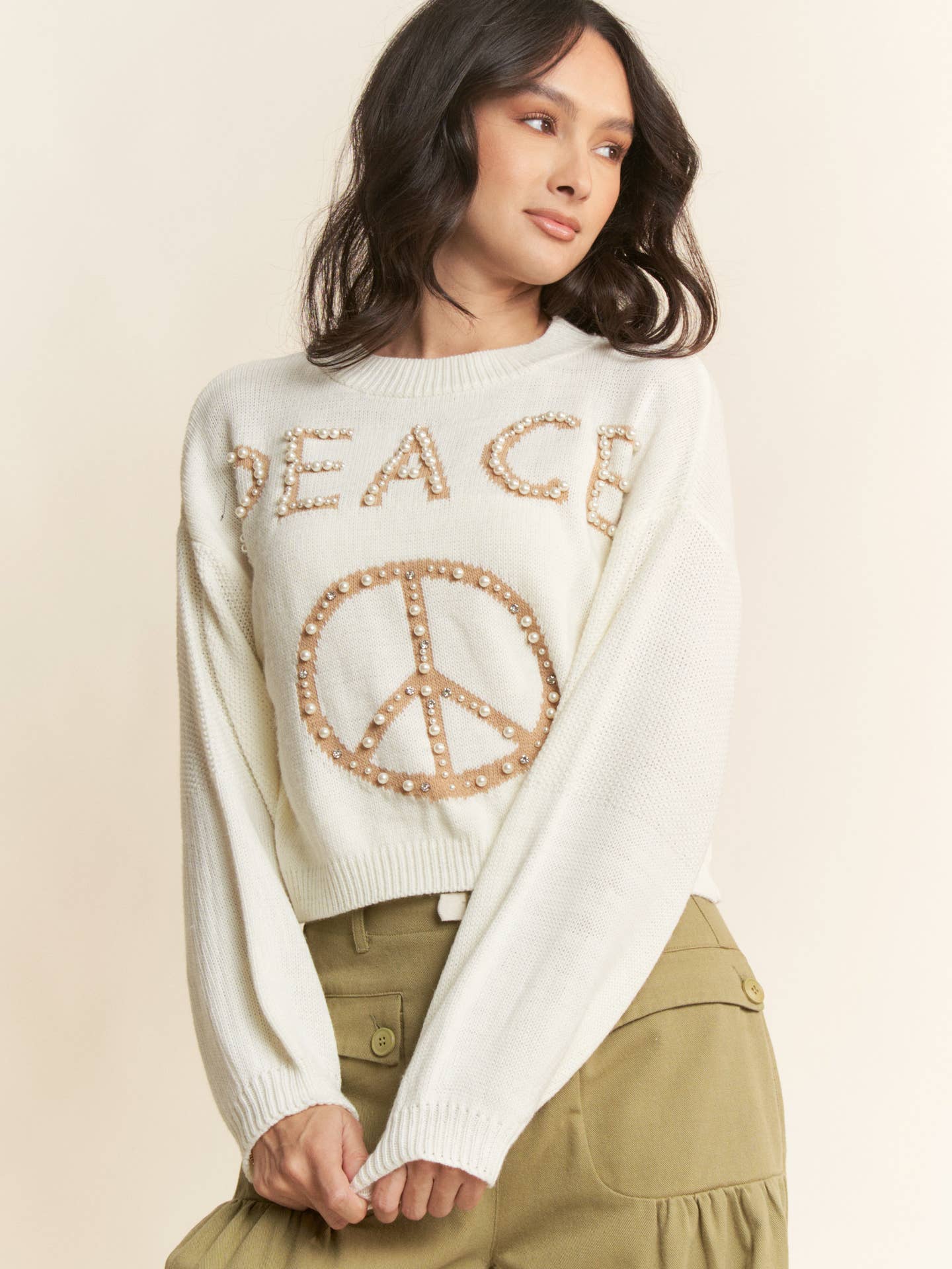Light-Weight Knit Pearl Studs Stone Sweater Top with PEACE