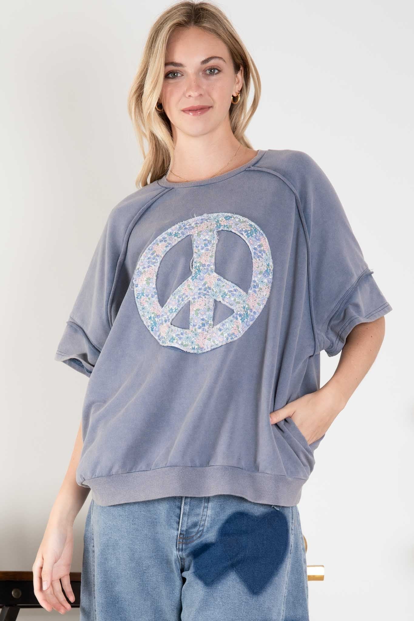 MINERAL-WASHED PEACE SIGN SHORT SLEEVE TERRY KNIT TOP