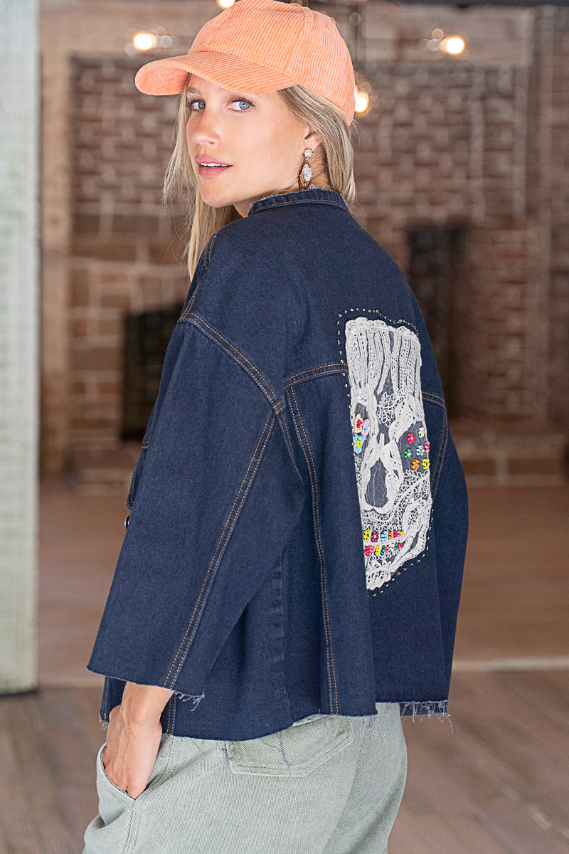 Designed in denim jacket with skeleton embroidery on back, flower shaped beads detailing on back, oversized fit with 3/4 sleeve, raw edge detailing.